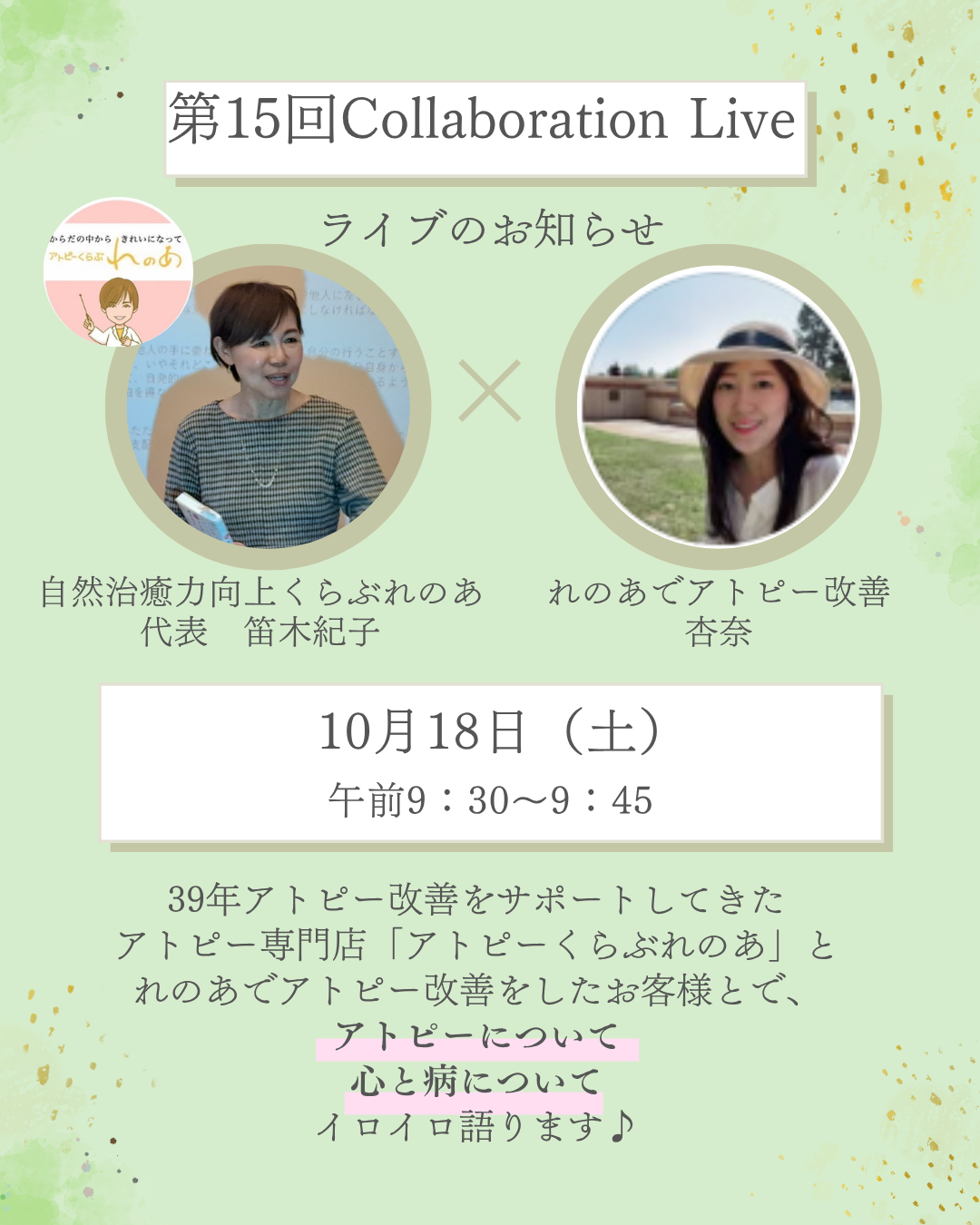 Instagramで誰でも無料でご視聴いただくことができます。 インスタライブ開催決定! アトピーくらぶれのあ代表笛木紀子と れのあでアトピーを改善されたお客様が Instagramでライブ配信をします♪ 【出演者のご紹介】 アトピーくらぶれのあ 代表 笛木紀子... -