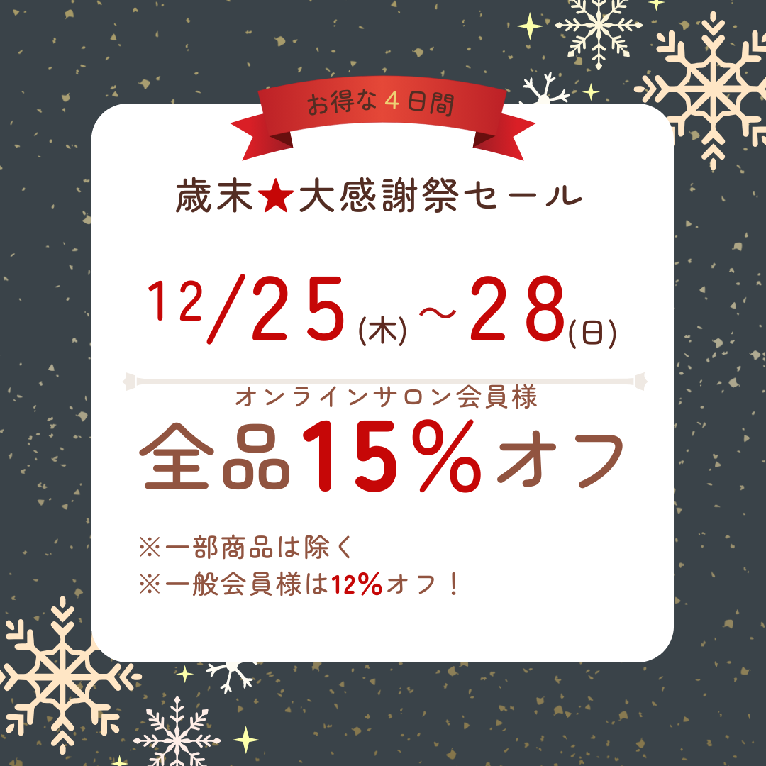 歳末☆大感謝祭セール【12月25日~12月28日まで】全品12%オフ&オンラインサロン会員様は15%オフ