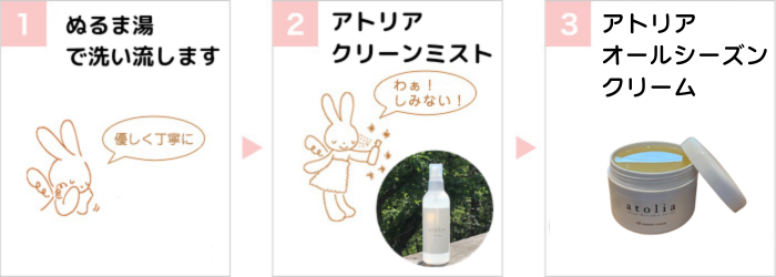 POINT❶ 日常の紫外線対策は、少し重めのクリーム(おすすめはアトリアオールシーズンクリーム)を塗ります。POINT❷ 海などの強い日差しに当たる時は、手作りのUVクリーム(アトリアオールシーズンクリームとベビーパウダーを1:1で混ぜたクリーム)を作ってこまめに塗布することをおすすめしています。